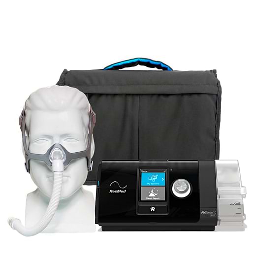Kit CPAP AirSense 10 Elite com Umidificador com a famosa máscara nasal Wisp, com armação em tamanho único e múltiplos tamanhos na embalagem.